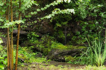 筧から落ちる水滴と、岩からにじみ出る水滴。